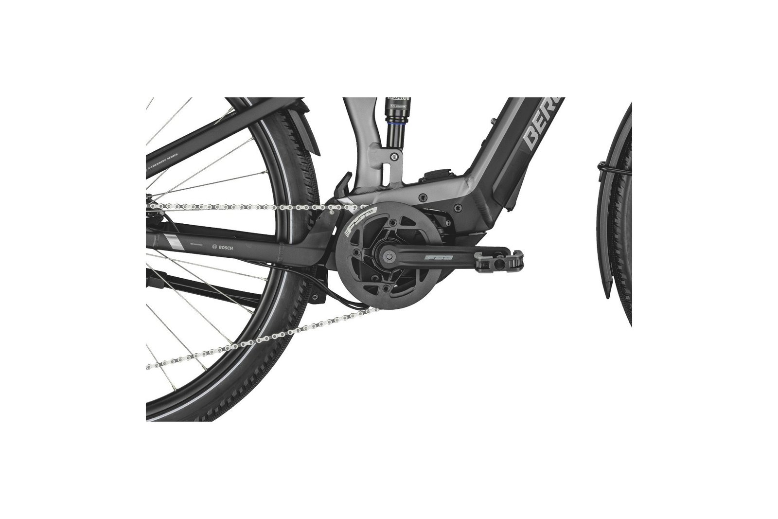Rahmen : 28″, ultra lite AL-6061 Rohrsatz, PowerTube Akku, 80 mm Federweg