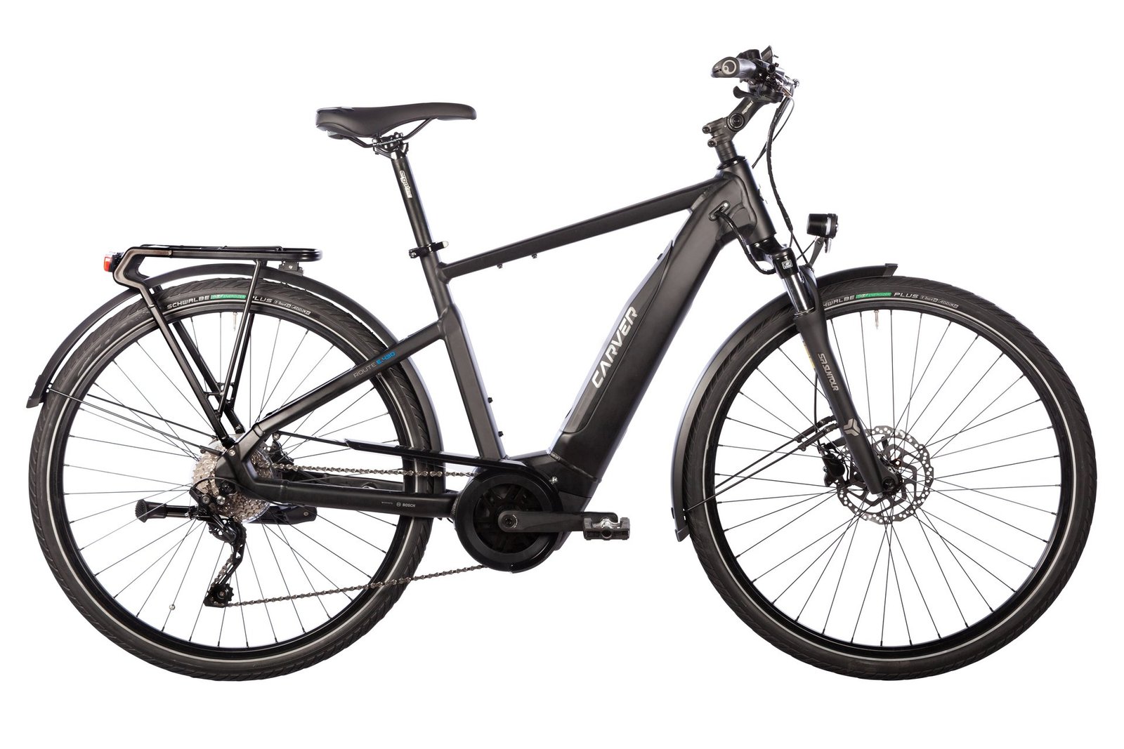 Aus dem Hause Carver kommt mit dem Route E.430 ein tolles E-Trekkingbike, das nicht nur dank seines schicken Diamant Rahmens aus Aluminium zu überzeugen weiß, sondern auch wegen des käftigen Bosch Performance Line Antriebs. Der kräftige Mittelmotor bringt ordentliche 63 Nm Drehmoment auf den Boden und befördert dich daher auch steile Anstiege problemlos hinauf. Auch die restliche Ausstattung weiß natürlich zu überzeugen, so zum Beispiel die 28″ Laufräder. Damit dir dabei nie der Saft ausgeht, kommt zudem ein 500 Wh Intube-Akku zum Einsatz. Herren, die auf der Suche nach einem alltäglichen Begleiter sind, dürften hier also fündig werden.